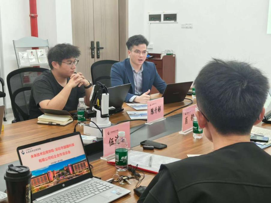 2025年11月18日下午,深圳市越疆科技有限公司朱海杰经理、陈升彬经理一行来访未来技术应用学院,就机器人实训建设、课程资源对接及外聘教师合作等事宜开展座谈交流。此次会议由学院科研副院长肖铮、人工智能教研室副主任李哲宏及智能机器人专业专任教师孙洪伟、谢胜灵共同参与。