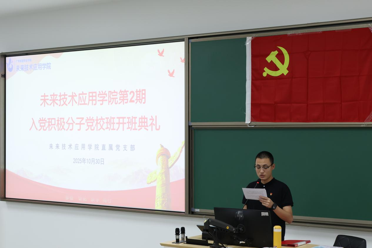 为深入学习贯彻习近平新时代中国特色社会主义思想,加强党员发展工作,筑牢青年学子的理想信念根基。未来技术应用学院于10月30日下午,在2号教学楼301课室开展未来技术应用学院第2期入党积极分子党校班开班典礼。出席此次活动的有未来技术应用学院直属党支部书记潘丹、副书记王立永、党建办公室指导老师郑新、及直属党支部委员会成员罗健、蒋灵怡、2024级入党积极分子、2025级团员。