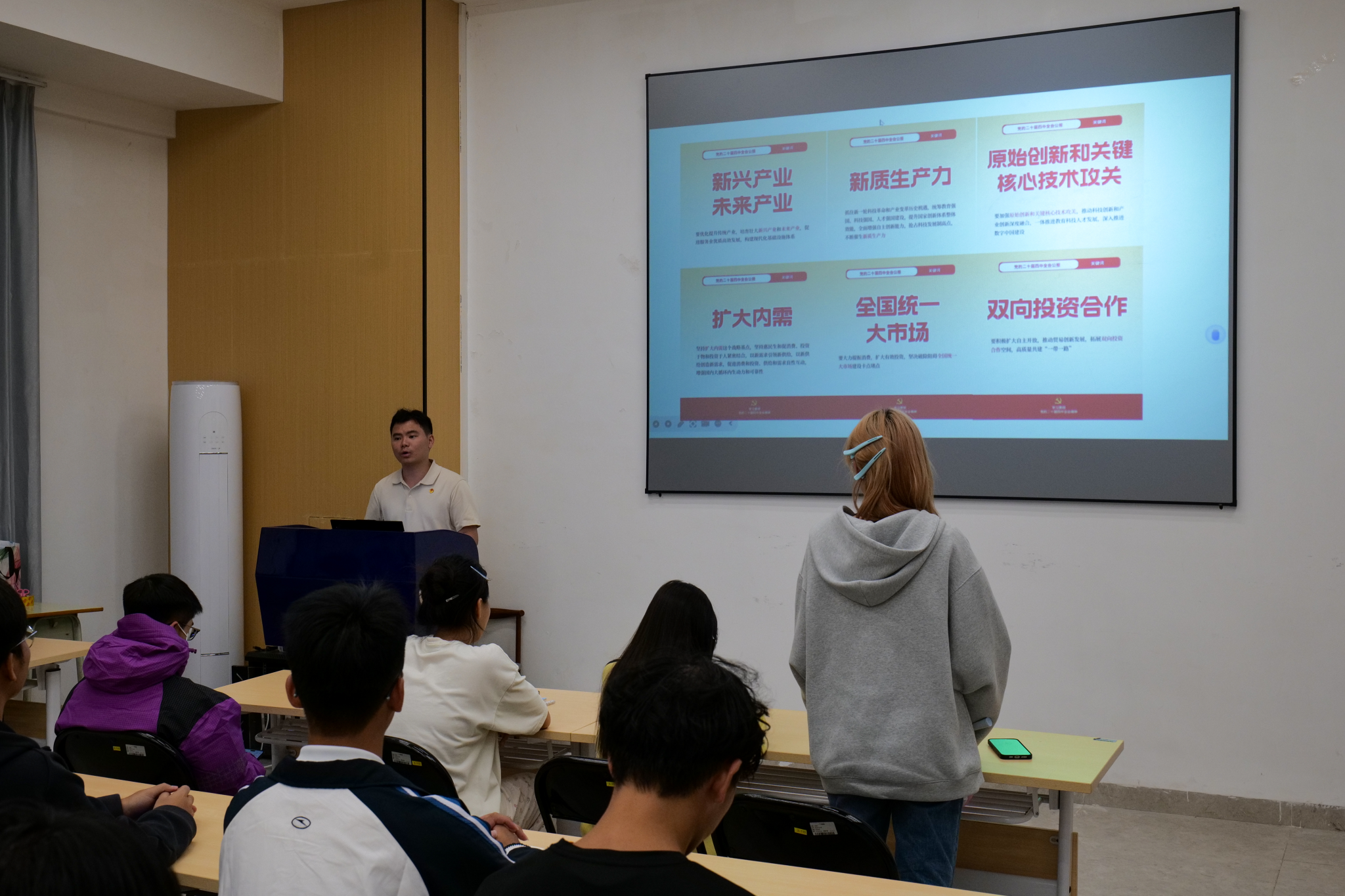会议中,学院团委指导老师刘凯力带领各班团支书及团员代表,共同学习了党的二十届四中全会精神及习近平总书记重要贺信精神。随后,针对习近平总书记近期重要贺信精神,刘凯力结合青年群体关注的科技、创新等领域展开解读。他重点领学了习近平总书记致2025世界智能产业博览会的贺信内容,详细阐述贺信中 “推动人工智能科技创新与产业创新深度融合,赋能经济社会高质量发展” 的核心要义。