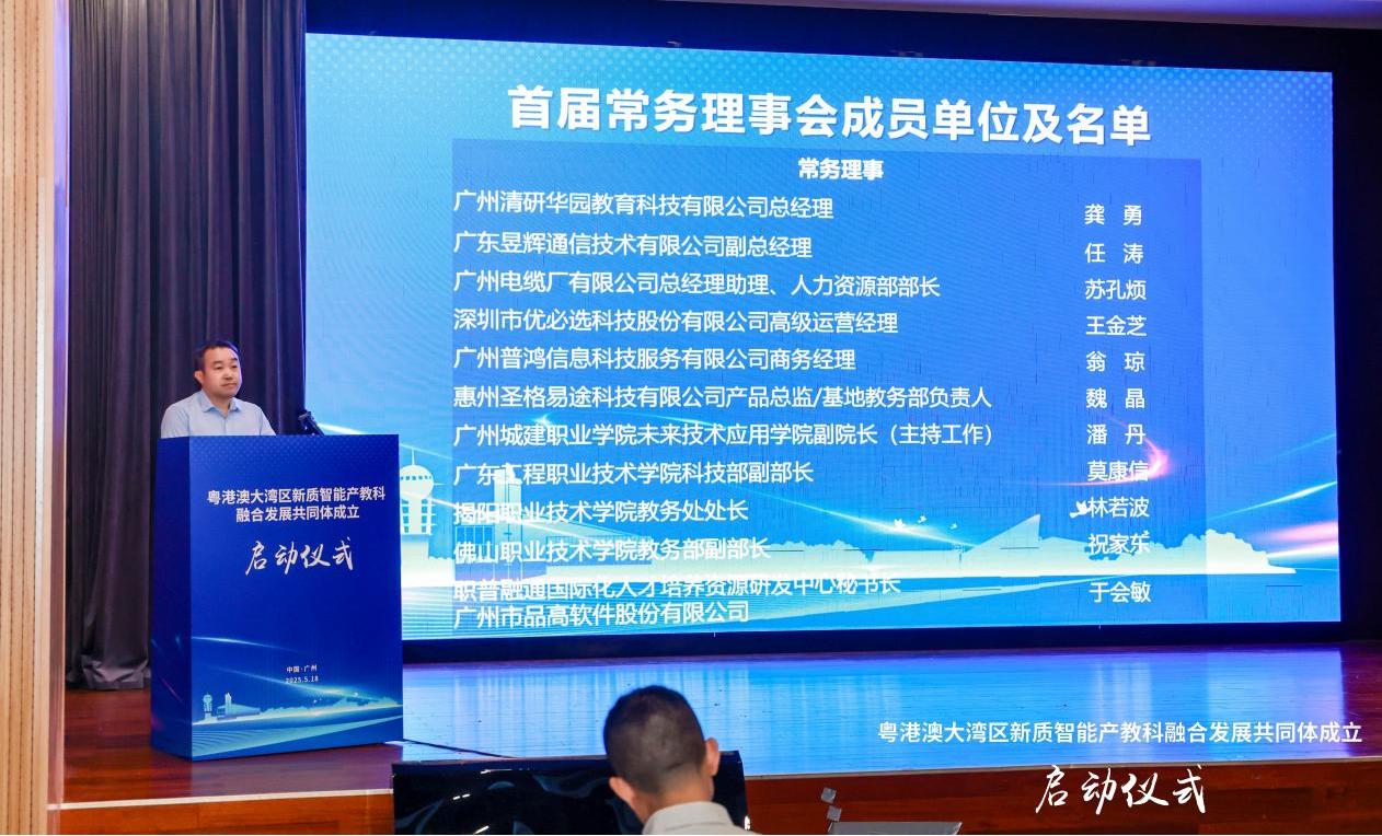 2025年5月15日,未来技术应用学院吴良胜教授代表学院赴广东轻工职业技术大学参加"粤港澳大湾区新质智能产教科融合发展共同体"成立大会暨首届常务理事会启动仪式。在启动仪式上,共同体首届常务理事会成员单位正式公布,广州城建职业学院未来技术应用学院成功入选理事单位,学院副院长潘丹受聘担任首届常务理事。