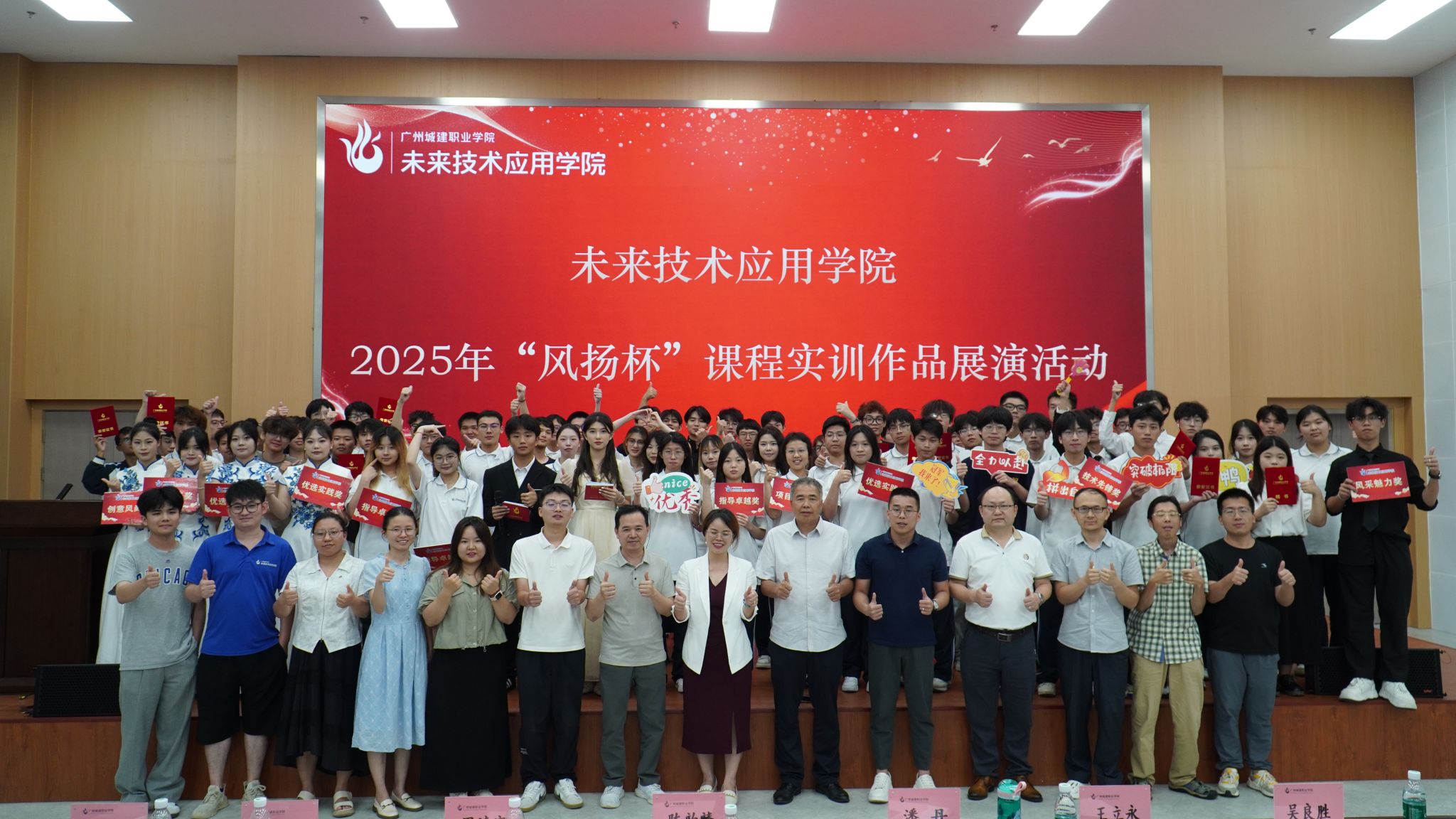 2025年7月2日晚,广州城建职业学院(清远校区)图书馆414报告厅内,未来技术应用学院2025年“风扬杯”课程实训作品展演暨直播活动璀璨启幕。本届展演活动以“项目驱动,实战育人”为主题,旨在通过课程实训作品的评选、展示与路演,全面呈现学生的创新实践能力与教师的课程教学成果,推动课程改革实现教学相长。本次展演活动吸引了来自学院人工智能技术应用、汽车智能技术和智慧城市管理技术三个专业11个班11门专业基础课程的23支优秀作品团队参加,更广泛赢得家长和云端朋友的关注,直播活动赢得4026人气,1.5万点赞。