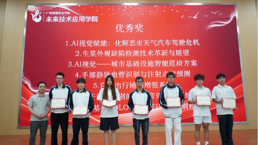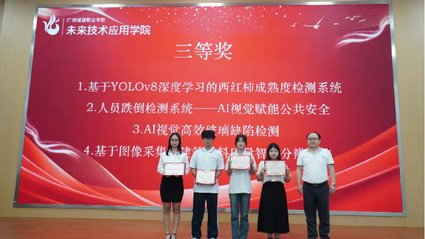 (基于YOLOv8 深度学习的西红柿成熟度检测系统:李佳芸、陈敏、黄颖、陈裕棠;人员跌倒检测系统—AI 视觉赋能公共安全:陈泽锋、刘少博、曹嘉椽、黄阿茵、韦湘;AI 视觉高效玻璃缺陷检测:谢子浩、高铭志、黄浩嘉、曾俊杰、王靖友;基于图像采集的建筑材料质量智能分辨系统:陈佳慧、姚胤凯、欧阳智坚)