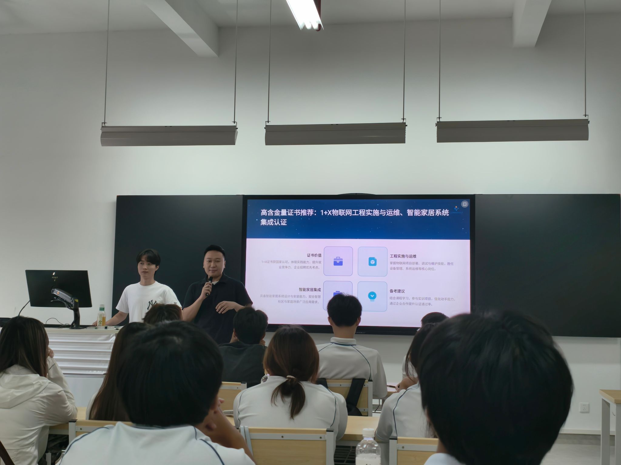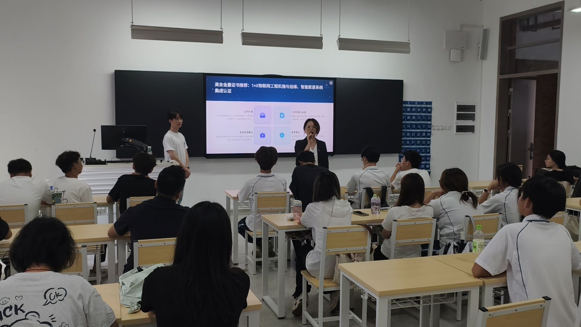 黄经理还给大一新生提供了行动指南和建议,建议学生在大一夯实数理与计算机基础,建立专业认知,拓宽行业视野;在大二精进专业技能,考取物联网、智能家居等高含金量证书,参与技能竞赛;在大三投身高质量实习,打磨简历与面试技巧,实现从校园到岗位的顺利过渡。他鼓励学生结合兴趣与市场需求,找准职业方向,在智慧城市的浪潮中定位自我,成就不可替代的职业价值。