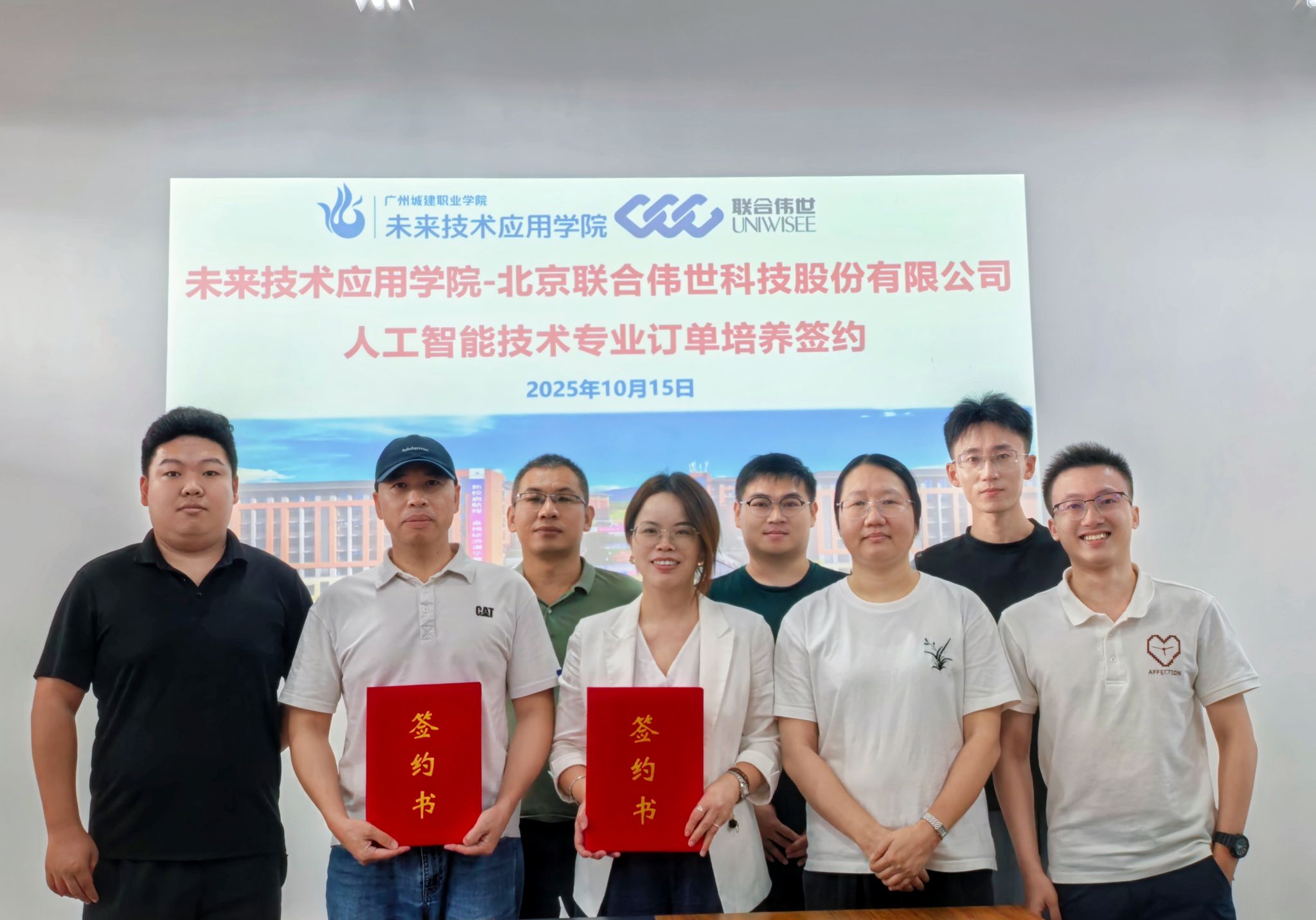 2025年10月15日,未来技术应用学院与北京联合伟世科技股份有限公司在学院会议室举行人工智能技术专业订单培养签约仪式。企业方由总经理梁国雄带队出席,学院参会人员包括潘丹院长、郑永芹副院长、姚袁教研室主任及教师代表曾奕秋、李浩、谢胜灵、莫绍懿、高树坤等。双方就深化校企合作、培养符合产业需求的高素质技术人才展开深入交流,并正式签署合作协议。