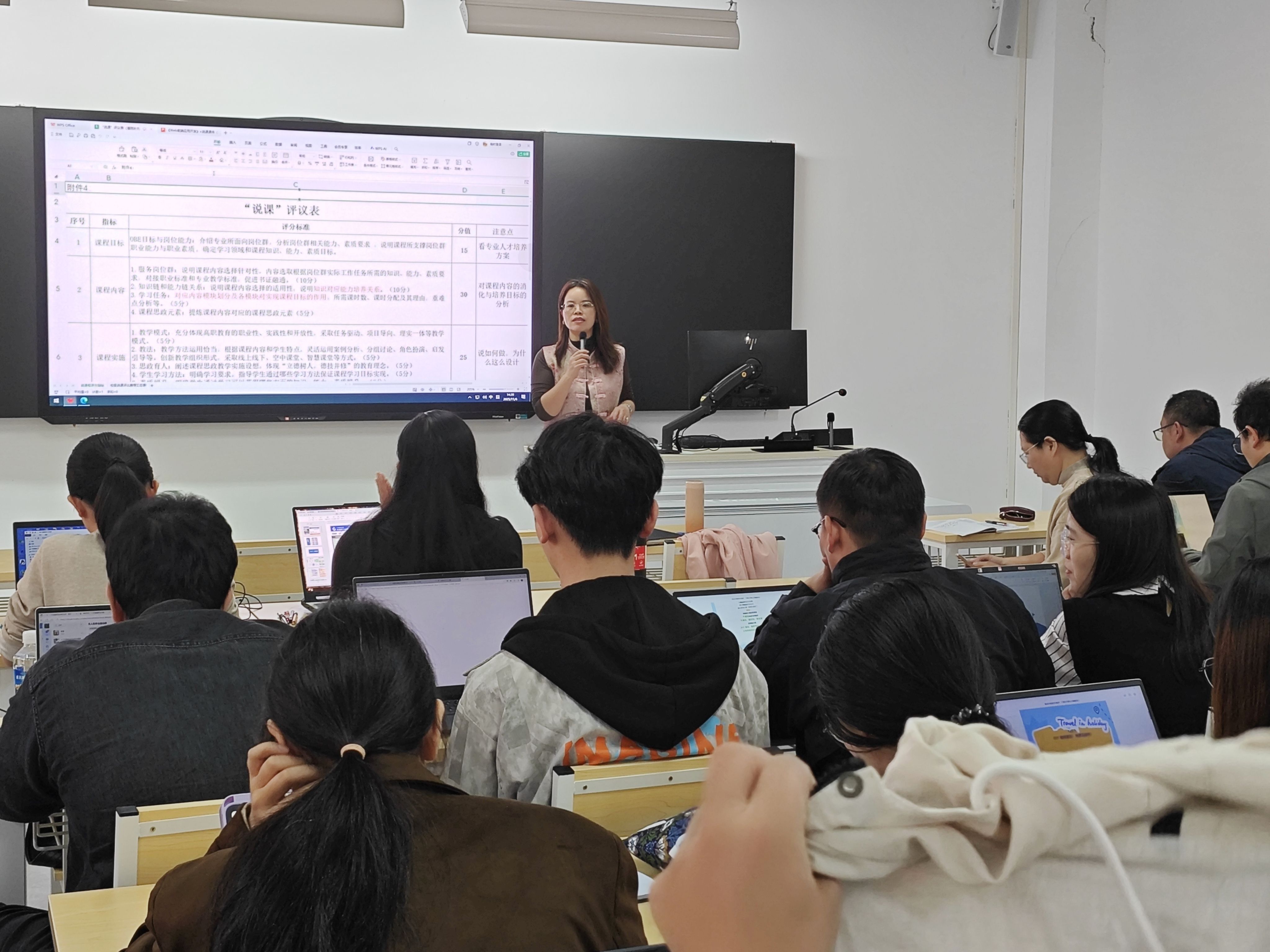 在说课展示后,郑永芹教学副院长结合校级说课比赛评分标准,从“教学目标与内容”“教学方法与手段”“教学评价与反馈”“课程特色与创新”四大维度进行了深度解读。她强调,说课需紧扣“以学生为中心”的理念,注重逻辑性、创新性和可操作性,同时需体现课程与行业需求的契合度。随后,活动进入自由交流环节,教师们围绕“如何平衡理论教学与实践环节”“如何设计分层教学任务”等议题展开热烈讨论,现场互动氛围浓厚。