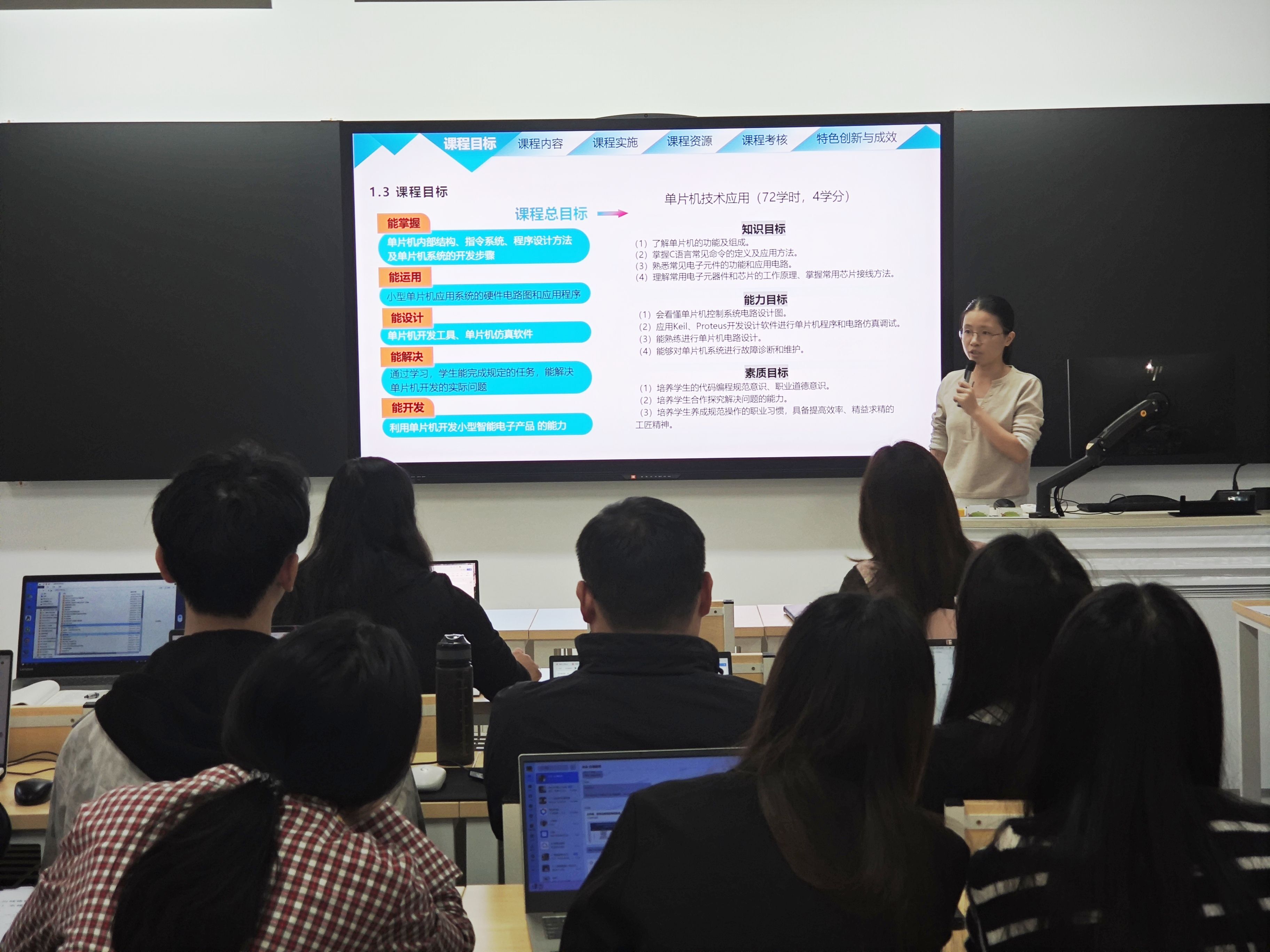 活动由黄莹莹老师和李哲宏老师进行说课示范。两位教师在上学期校级说课比赛中均荣获一等奖,教学经验丰富、方法创新。黄莹莹老师以《单片机技术应用》课程为例,从课程设计逻辑、教学重难点突破、学生互动设计等方面展开分享;李哲宏老师则围绕《Web前端应用开发》课程,重点展示了如何将行业前沿技术融入课堂,激发学生的学习兴趣。两位老师的示范内容详实、风格鲜明,为在场教师提供了可借鉴的实践范例。