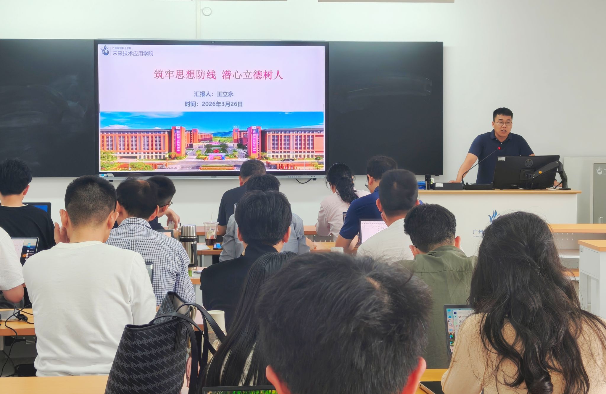 3月26日下午,未来技术应用学院在F3-504教室召开例会,副院长王立永、郑永芹、肖铮及全体教师共同参会。会议围绕师德师风建设、政策文件解读、教学巡查反馈及科研课题申报四大议程展开,其目的在于强化教师队伍管理,提升教育教学质量。