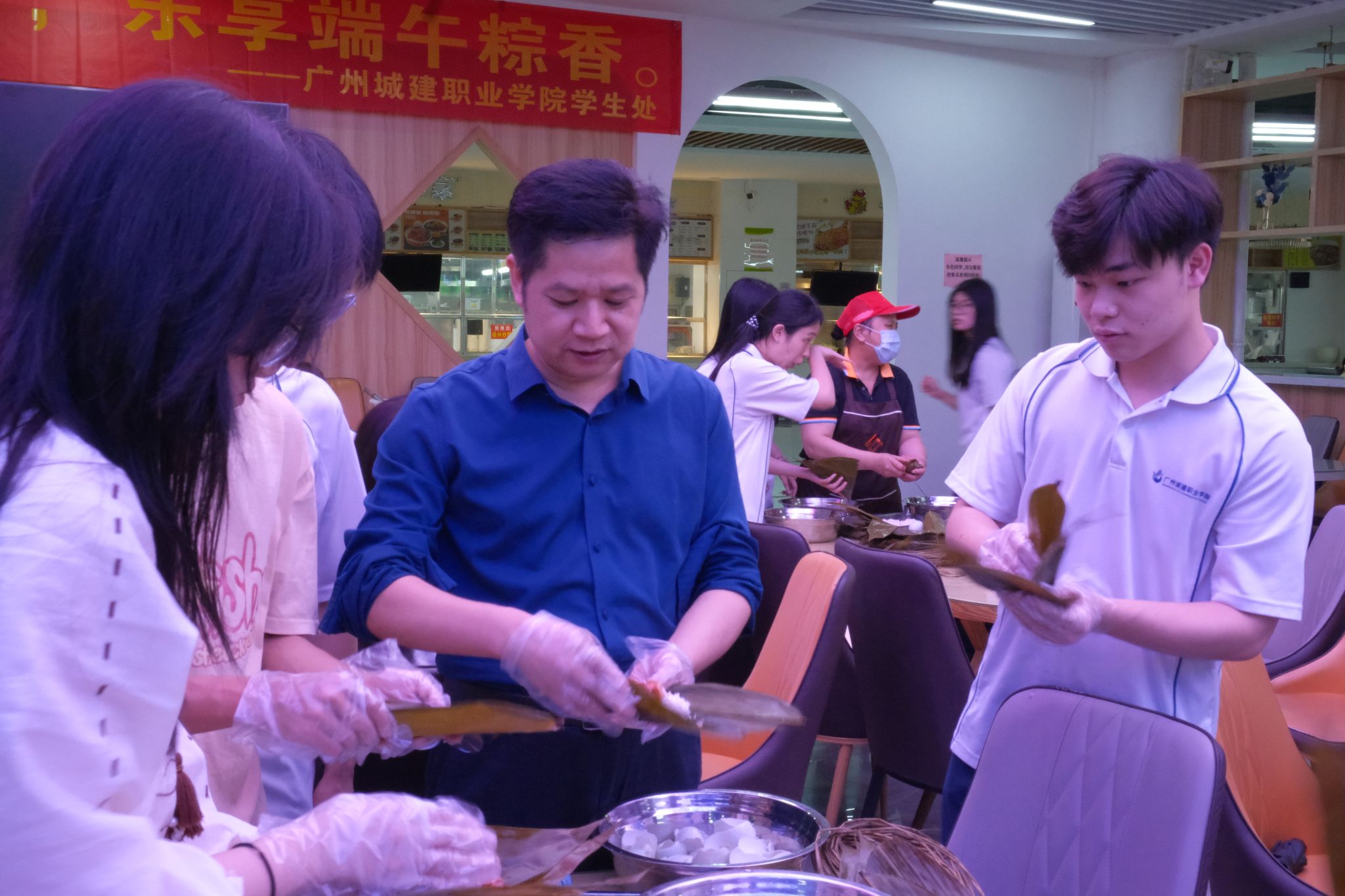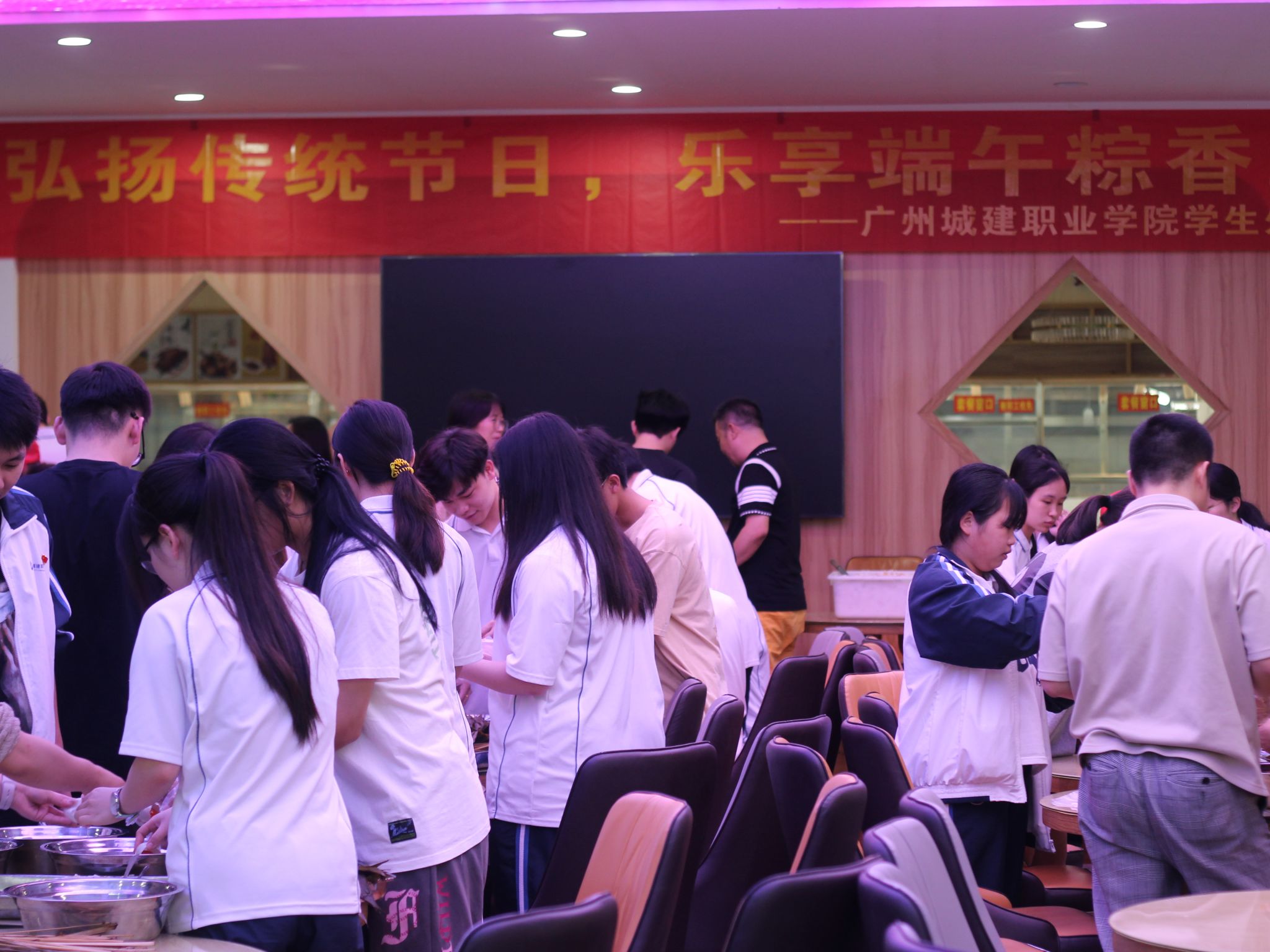 为弘扬中华民族优秀传统,挖掘和传承端午节文化内涵,丰富学生生活,增进师生感情,我校于6月6日在二区饭堂举办了“弘扬传统节日,乐享端午粽香”主题活动。校长助理孔练光、学生处副处长谭宇欣以及师生代表参加了活动。