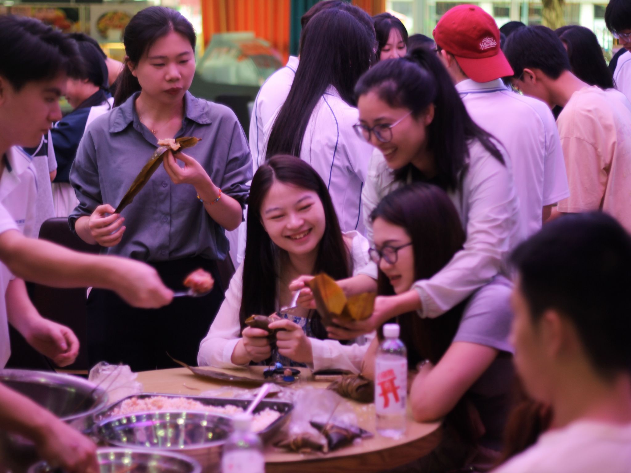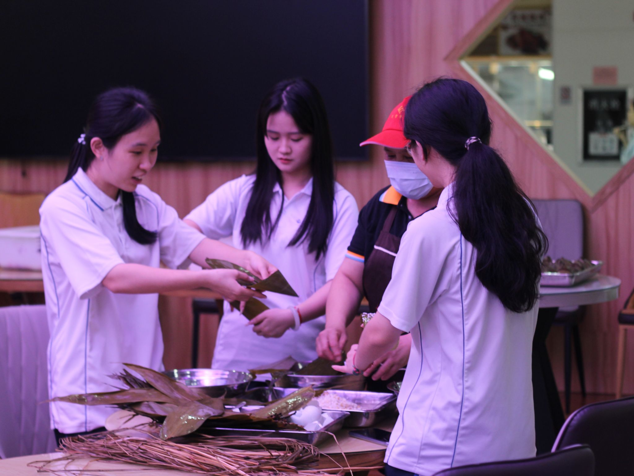 活动现场,桌子上摆满了新鲜的粽叶、糯米、鸭蛋等食材,还有各式各样的包粽子工具,饭堂阿姨向师生们详细介绍了粽子的制作方法,师生们认真学习,大家互相帮助,其乐融融,现场气氛热烈而温馨。在包粽子的过程中,师生们不仅感受到了传统文化的魅力,还增进了彼此之间的友谊。经过一个多小时的努力,一个个饱满圆润、小巧玲珑的粽子呈现在大家面前,凝聚了师生们的心血和汗水,大家都露出了开心的笑容。