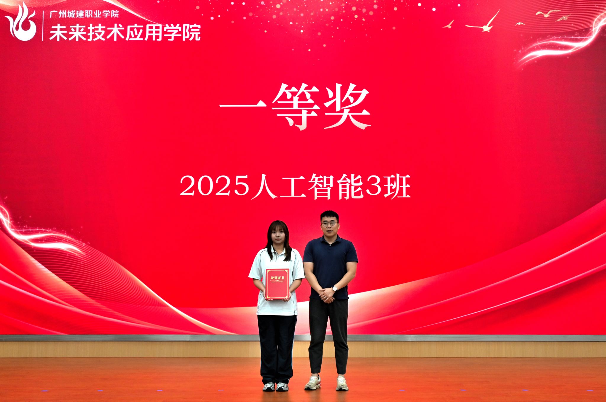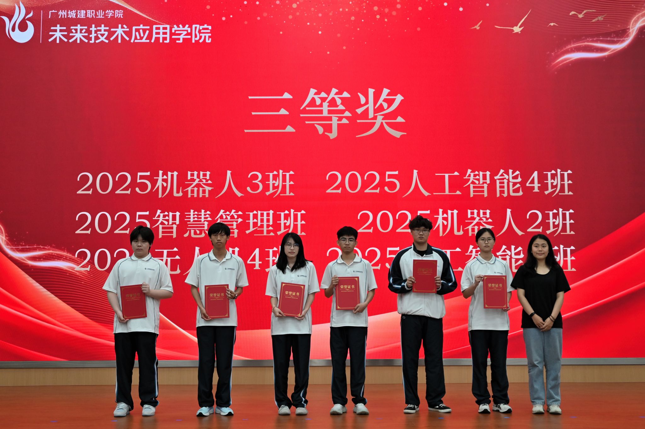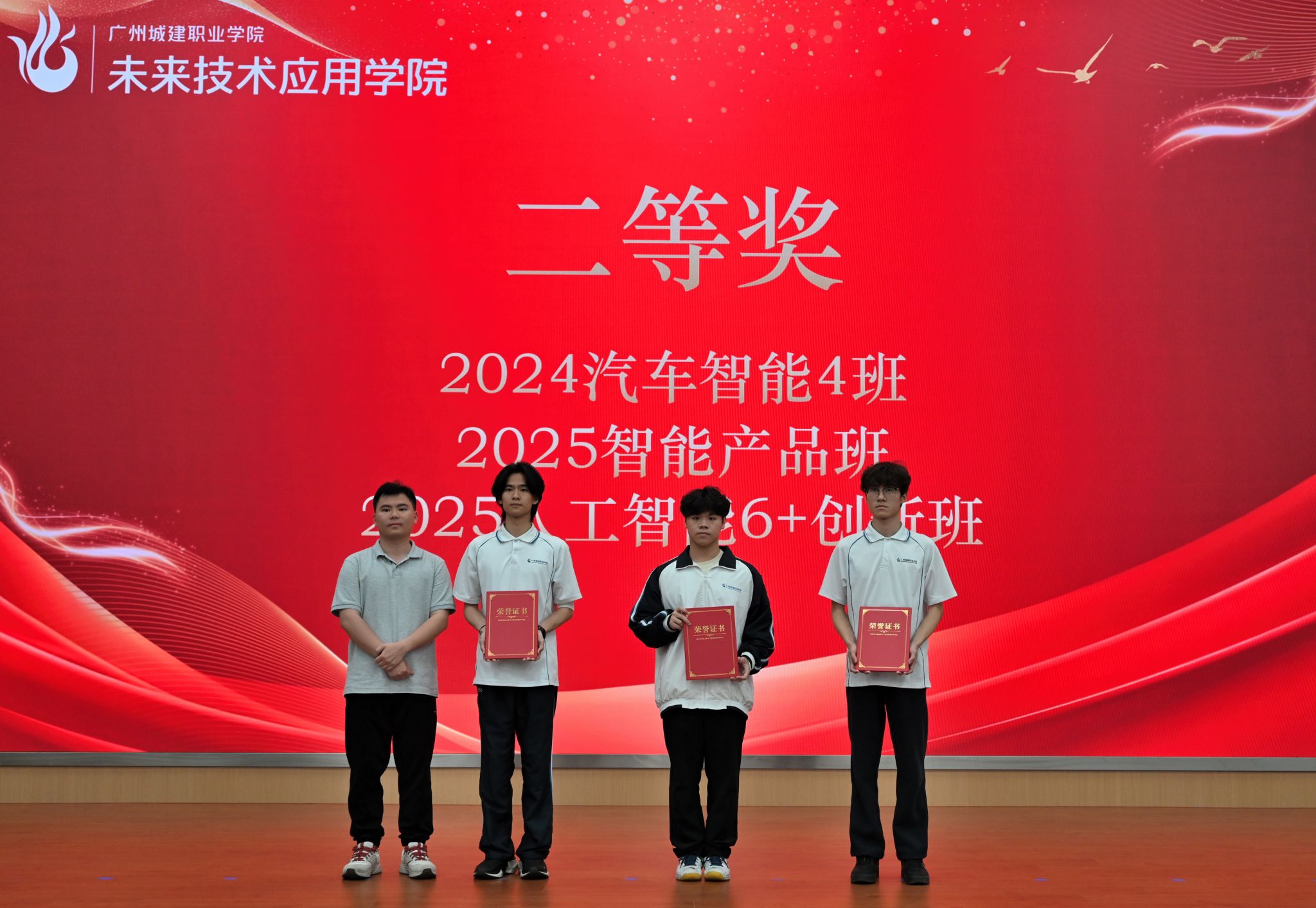 随后,仪式进入颁奖典礼环节。主持人现场宣读了《未来技术应用学院学风建设“十佳班级”表彰决定》,明确了获奖班级名单,对获奖班级在学风建设中取得的突出成绩予以表彰。获奖班级充分展现了我院学子的良好精神风貌,为全院各班级及学生树立了可学可做、可追可及的榜样。