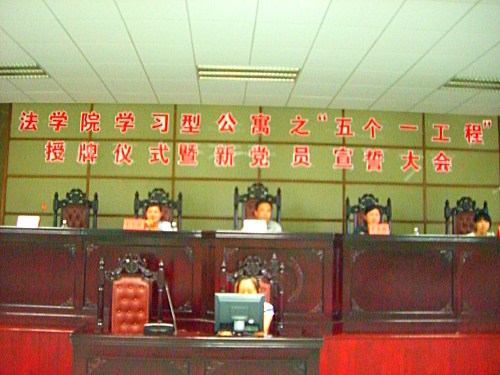 为了进一步扩大党员“创先争优”的影响力,学院于9月14日下午一点半在模拟法庭召开了“tyc7111cc太阳成集团学习型公寓之‘五个一工程’授牌仪式暨新党员宣誓大会”。学院党总支书记蔡国金老师,党总支副书记罗金艳老师、学办主任兼分团委书记王文婷老师以及辅导员张诗弦老师出席了此次大会。王文婷老师主持了会议。