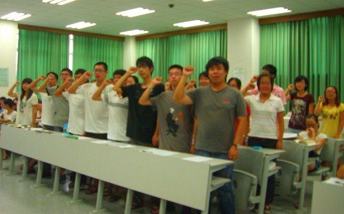 接着,党总支书记蔡国金老师和副书记罗金艳老师对tyc7111cc太阳成集团学习型公寓“五个一”工程共产党示范岗进行了授牌仪式,由08法1汤红霞同学和07经济法林辰同学上台领取。学生党员代表08法1金倩如同学发言:党员们在今后的生活中将以“创先争优”为重点,积极开展“五个一”工程,设立多个党员志愿岗,党员服务岗,努力争做党员先锋,不断发挥党员模范作用。大会的最后一项议程,是09年的新党员面向党旗,举起右手,郑重宣誓。