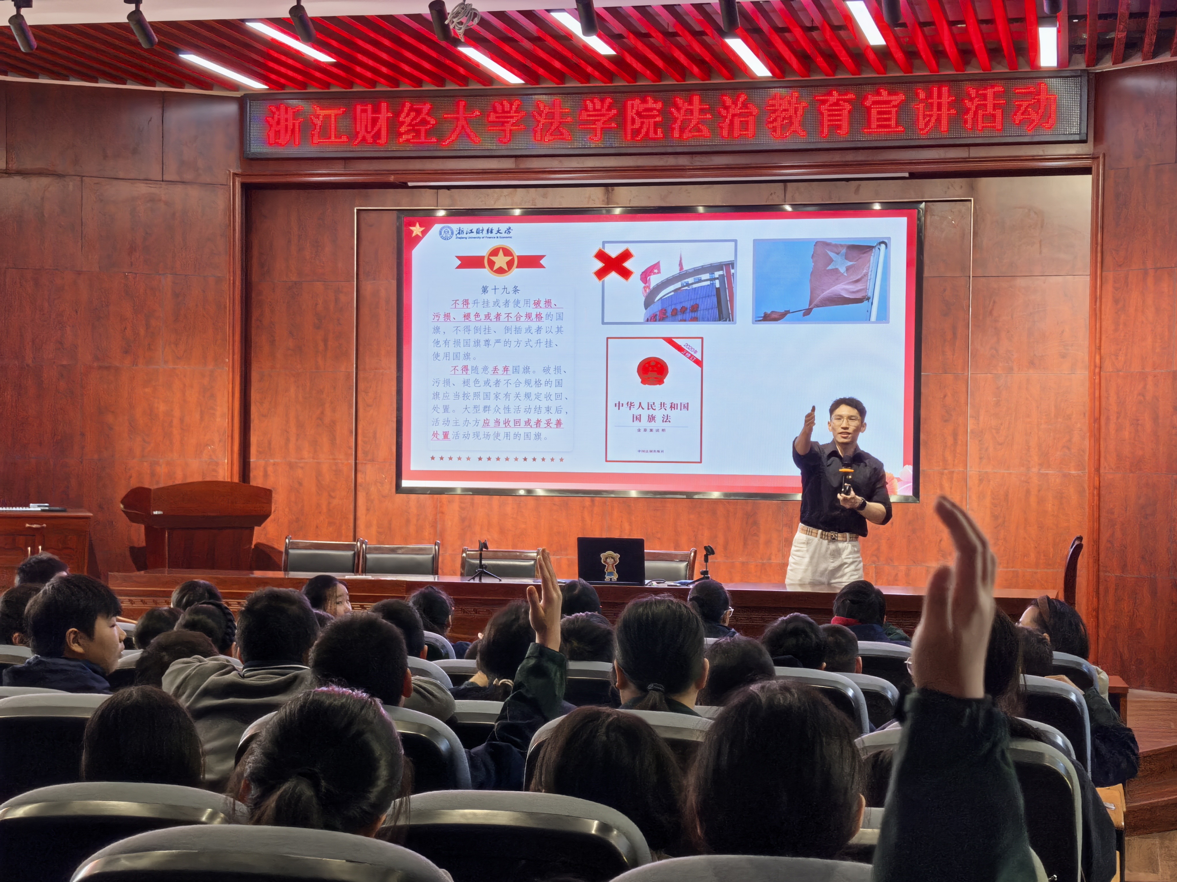 宣讲团成员们匠心独运,将原本枯燥的法律条文转化为生动有趣的互动课程,用通俗易懂的语言讲解《爱国主义教育法》《民法典》等法律法规,以五星红旗为引子,讲述国旗的日常使用、升旗仪式、降半旗的法条,让学生在轻松愉快的氛围中深刻理解并铭记这些重要知识,激发了学生的爱国情怀和法治意识。当宣讲团成员深情讲述《义勇军进行曲》成为国歌的历史时刻,那激昂的旋律仿佛穿越时空,让学生们亲身经历了国家从苦难中崛起、迈向辉煌的壮丽征程,对国歌的理解也从简单的音符升华为了对国家深厚情感的共鸣和对民族精神的深刻认同。