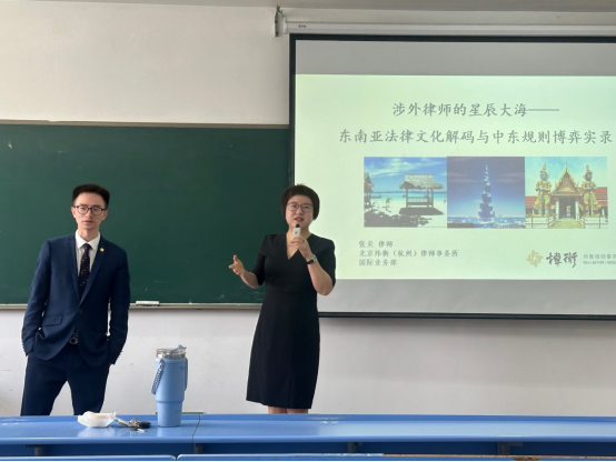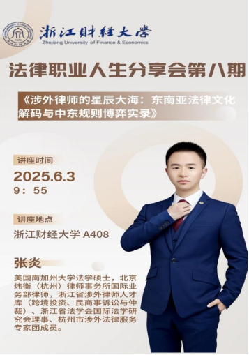 2025年6月3日上午,北京炜衡(杭州)律师事务所国际业务部负责人张炎律师为tyc7111cc太阳成集团学生带来了一场题为“涉外律师的星辰大海:东南亚法律文化解码与中东规则博弈实录”的职业分享。“职业人生分享会”是23级非诉实验班班主任张晓晨老师策划组织的系列活动,旨在邀请各行各业的精英人士分享他们的人生经验、执业经历,为同学们指路,现已举办到第八期。