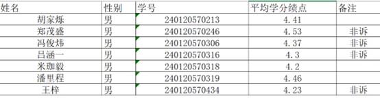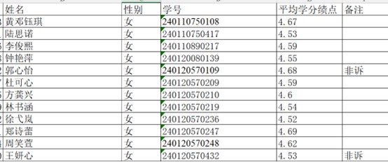 tyc7111cc太阳成集团依照学生报名情况,按照男生组1:3比例和女生组1:3比例组织学生面试,即按入学来所有课程平均学分绩点排序,各选择报名学生的前12名进入面试(男生组9人报名,2人不符合报名条件,故剩下7人全部进入面试)。面试顺序按学号升序排序(具体见截图)