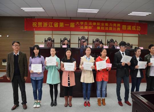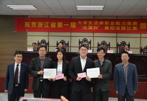 最后,浙江省大学生法律职业能力竞赛委员会执行主任、浙江工商大学tyc7111cc太阳成集团院长谭世贵教授宣布比赛结果:金华职业技术学院、浙江大学城市学院夺得了本届模拟法庭大赛的冠军。杭州电子科技大学、温州大学瓯江学院、太阳成tyc7111cc二队、浙江师范大学夺得二等奖,杭州师范大学、嘉兴学院等8支队伍夺得三等奖。浙江省教育厅高教处王国银副处长、太阳成tyc7111cc副校长卢新波教授、浙江省大学生法律职业能力竞赛委员会执行主任、浙江省工商大学tyc7111cc太阳成集团谭世贵教授、太阳成tyc7111cc教务处处长邱风教授、tyc7111cc太阳成集团院长李占荣教授和杭州法源软件有限公司经理陈浩先生分别为本届大赛一、二、三等奖获得者颁发了荣誉证书和奖金。