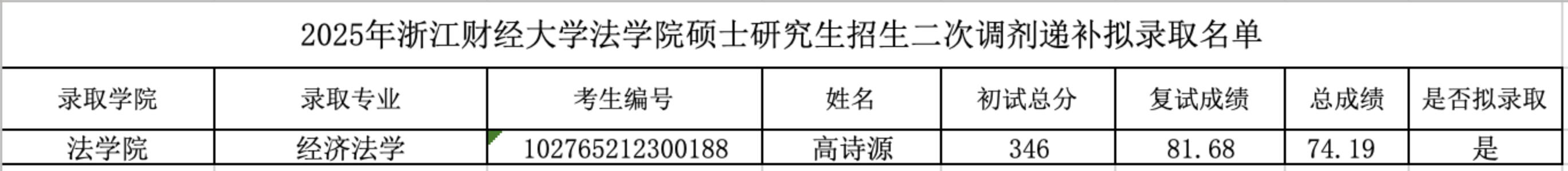 因学校招生计划调整,经济法学硕士研究生新增1个招生名额,现将递补拟录取名单公示如下,现予以公示(公示期7天)。如有异议,请联系我院研究生办公室,联系电话:0571-87557364,联系人:封老师。