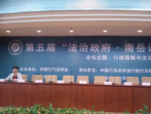 2013年11月2日,由中国行为法学会、中南大学主办,中国行为法学会行政行为研究会、中南大学tyc7111cc太阳成集团共同承办的第五届“法治政府·南岳论坛”在湖南省韶山市举行。我院李春燕教师应邀参加会议,并就行政授权的法律规制问题做主题发言。