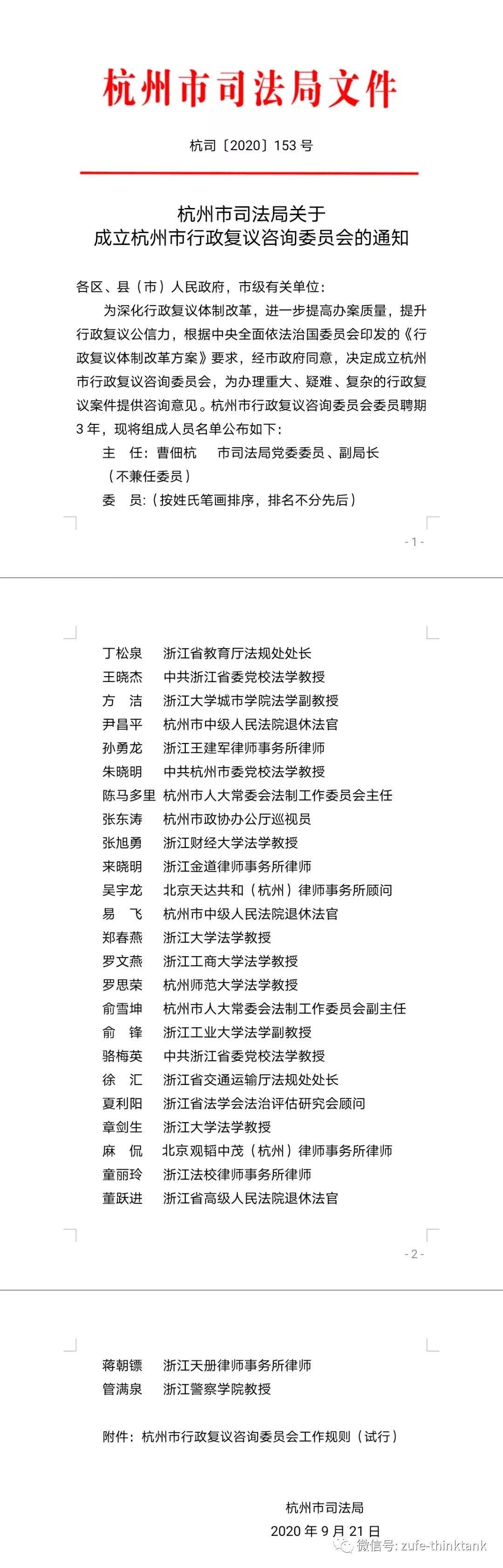 2020年9月21日,杭州市司法局印发了《关于成立杭州市行政复议咨询委员会》的通知,并公布了委员会组成人员名单。我院张旭勇教授名列其中,受聘为杭州市行政复议咨询委员会委员,聘期3年。