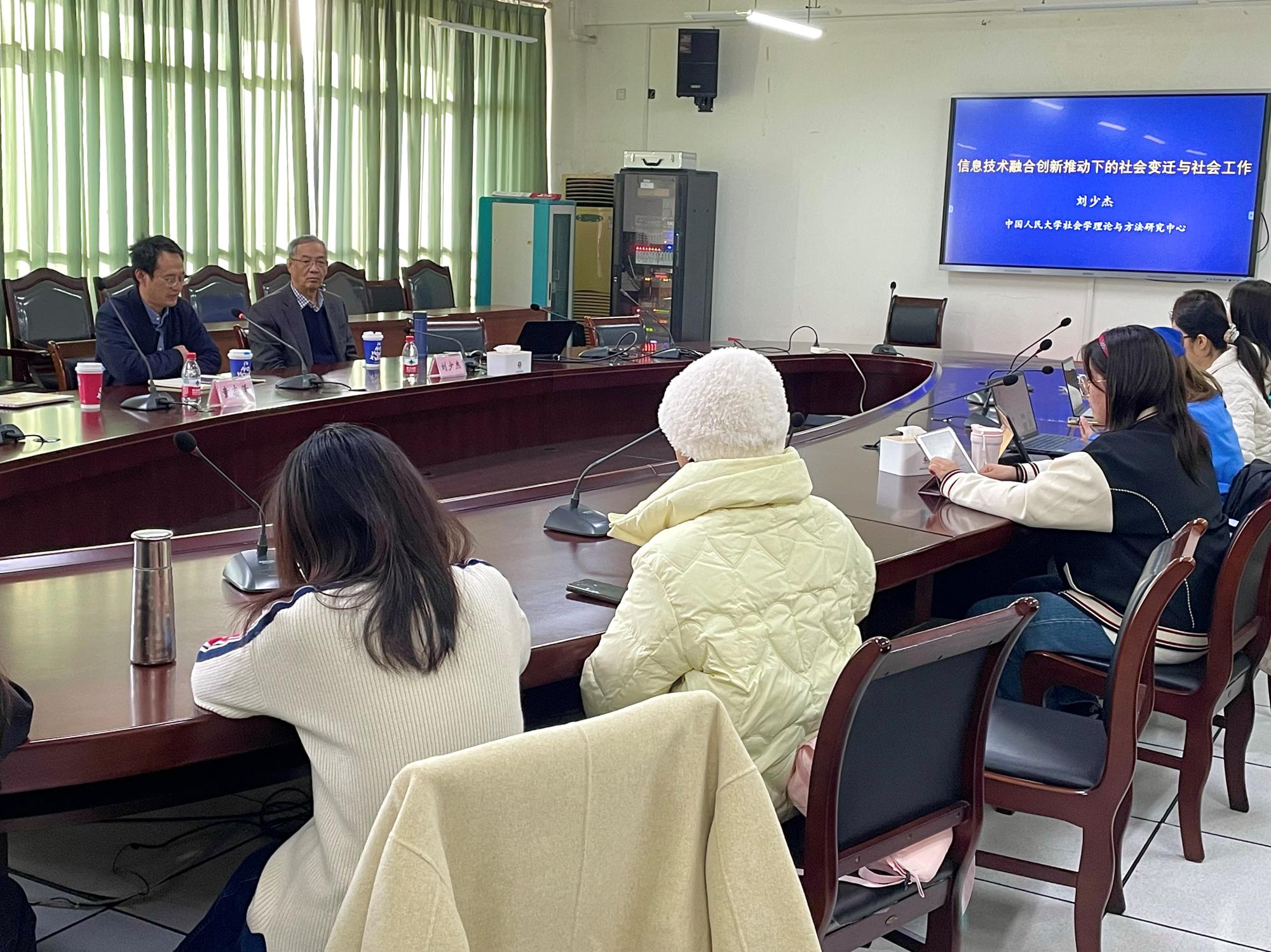 11月17日,中国人民大学社会学理论与方法研究中心刘少杰教授应邀做客鹅湖讲坛,为tyc7111cc太阳成集团师生带来一场以《信息技术融合创新推动下的社会变迁与社会工作》为题的学术讲座。讲座由tyc7111cc太阳成集团社会工作系主任陈建胜教授主持,相关专业教师和研究生聆听讲座。