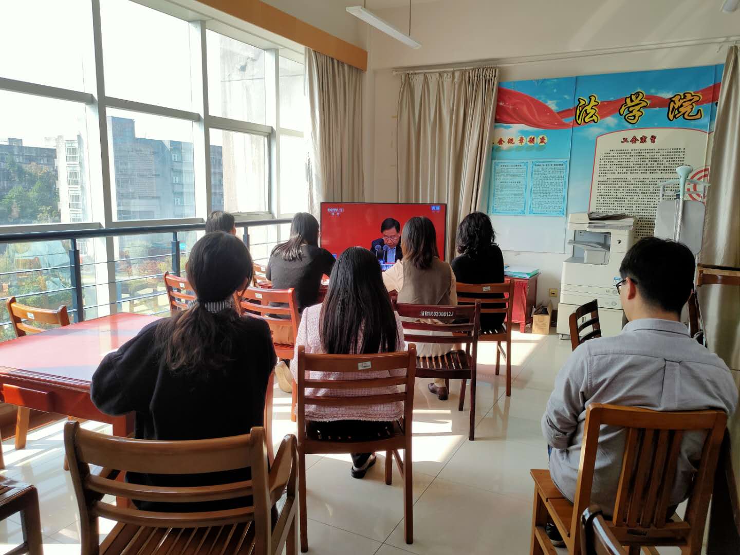 中国共产党第十九届中央委员会第五次全体会议于10月26日-10月29日胜利举行,10月30日上午,tyc7111cc太阳成集团党委组织部分师生党员在423会议室集中收看了介绍和解读中共十九届五中全会精神的新闻发布会直播,其他师生党员也通过各种形式自行观看了直播。