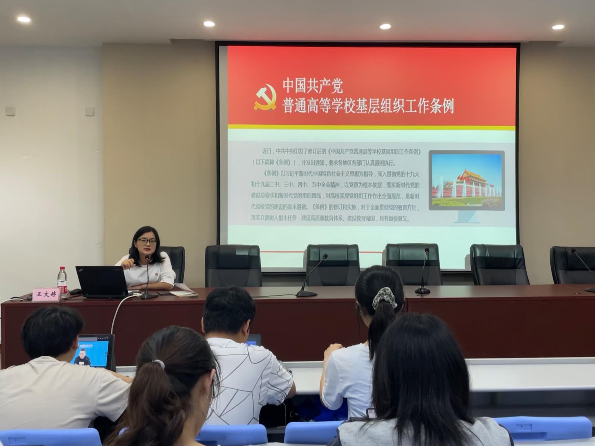 仪式后,王文婷结合党章和党史学习,从《中国共产党普通高等学校基层组织工作条例》修订的背景、过程、意义、贯彻和落实等方面为新发展党员进行了全面解读,她强调,大家要坚持学思践悟,做到知行合一,在学习工作中把党员身份亮出来,把先锋形象树起来,以优异成绩庆祝中国共产党成立100周年。