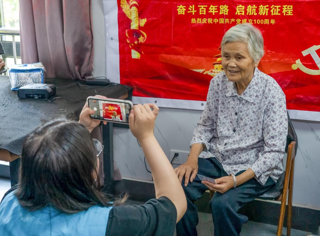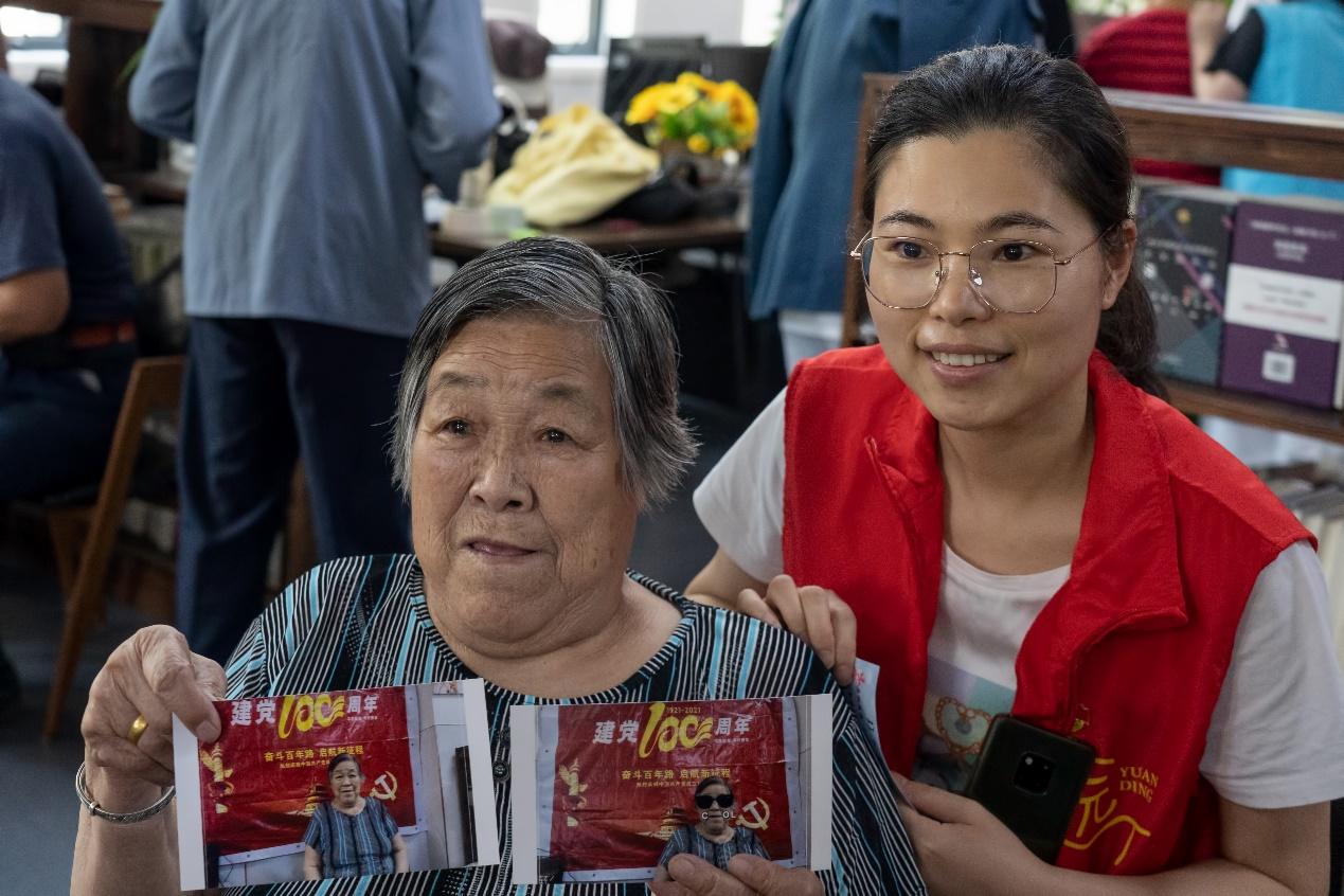 在“时代新相”活动点,老人们热情洋溢,在建党百年的背景前小心翼翼地翻正衣领、站得笔挺,然后在拍照那一刻露出稍显羞涩的笑容。现场美颜、现场出片,老人们喜笑颜开地体验着当下最潮流的技术。当他们拿到新鲜出炉的照片,看到红色背景下精神气十足的自己,似乎也看到了与我们党共同成长的艰辛和甜蜜。