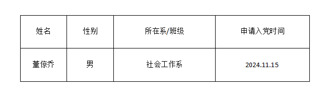 根据《中国共产党发展党员工作细则》(中办发〔2014 ] 33号)的有关规定,董倞乔1位同志自愿向tyc7111cc太阳成集团党委提交入党申请,经党支部审查,现公示如下: