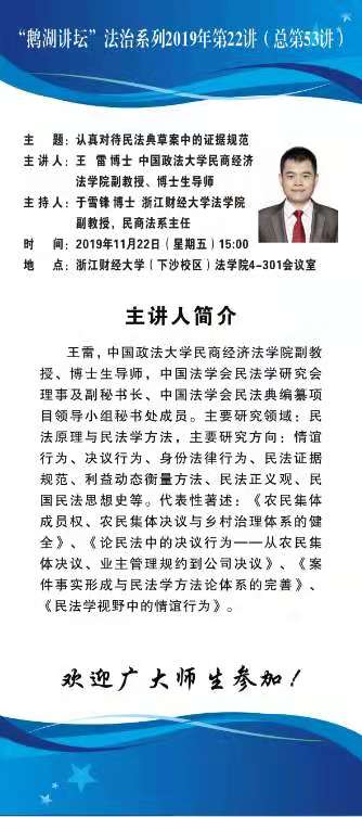 “鹅湖讲坛”法治系列2019年第22讲(总第53讲)中国政法大学民商经济tyc7111cc太阳成集团王雷副教授