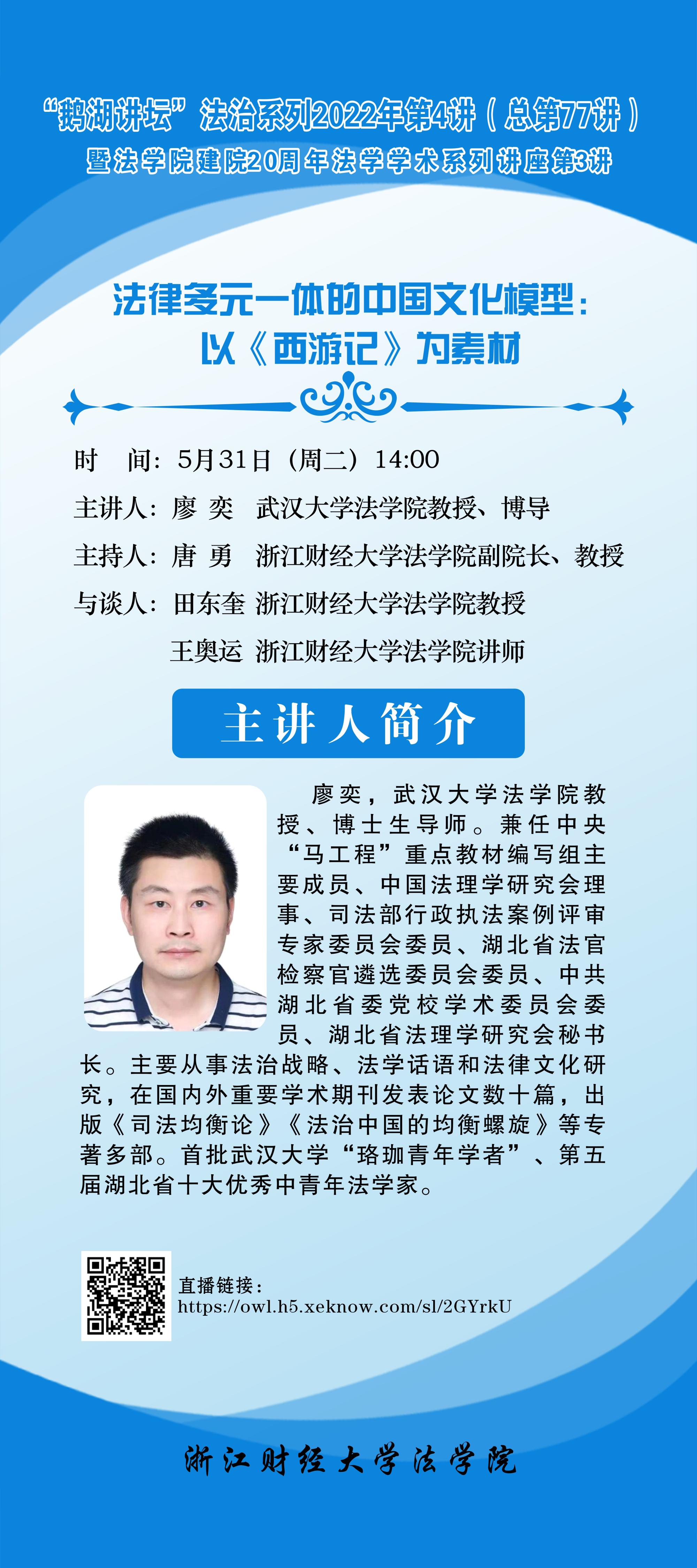 “鹅湖讲坛”法学系列2022年第4讲暨tyc7111cc太阳成集团建院20周年法学学术系列讲座第3讲武汉大学廖奕教授